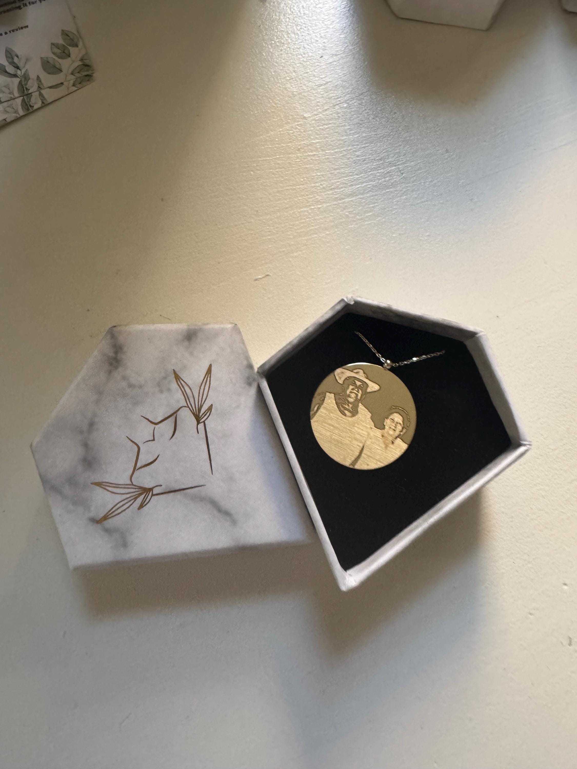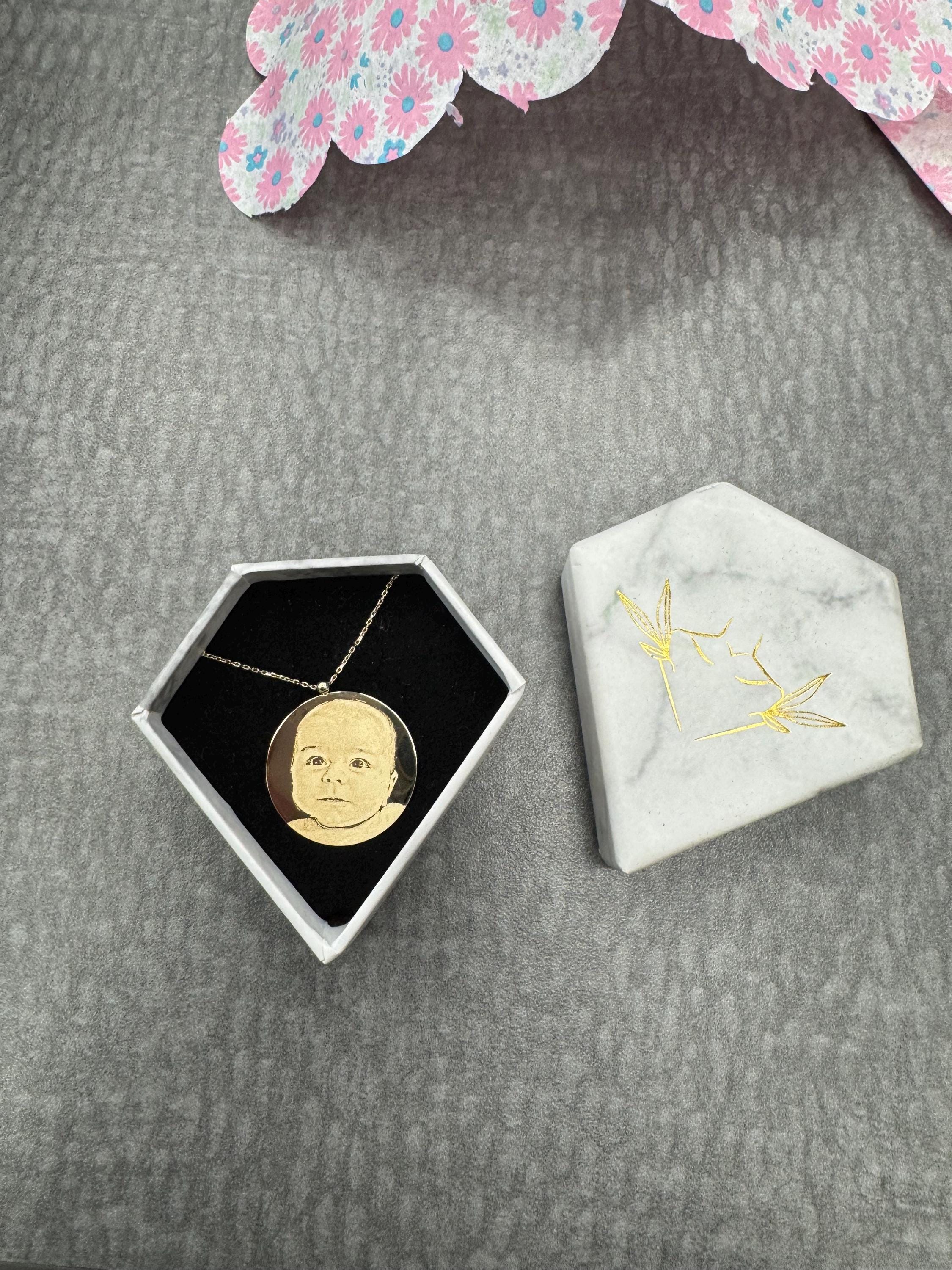 ♥ Our necklaces are custom-made with ANY photo of your choice! Simply provide us with one or two clear photos, and we'll skillfully engrave them onto the pendant made of 14K solid gold.
