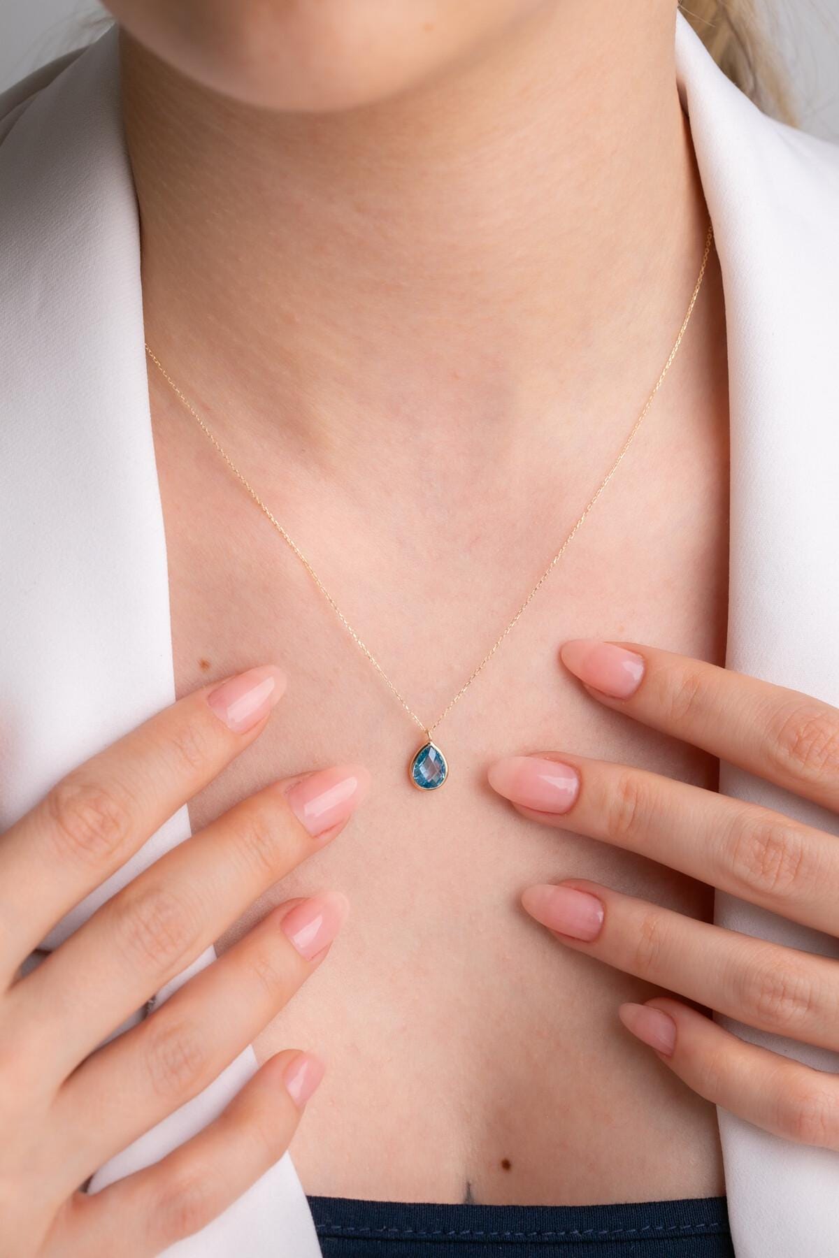 The 14K Gold Aquamarine Pear Shaped Necklace is a breathtaking piece, featuring a beautifully faceted blue stone. Its elegant design makes it an ideal birthday gift, a thoughtful gift for a bride, or a memorable anniversary gift. This necklace captures the serene beauty of aquamarine, ensuring that any recipient feels special and cherished. A timeless piece that adds a touch of sophistication to any jewelry collection.