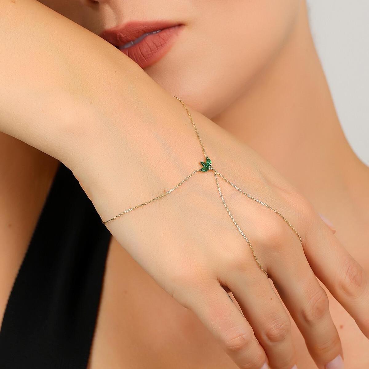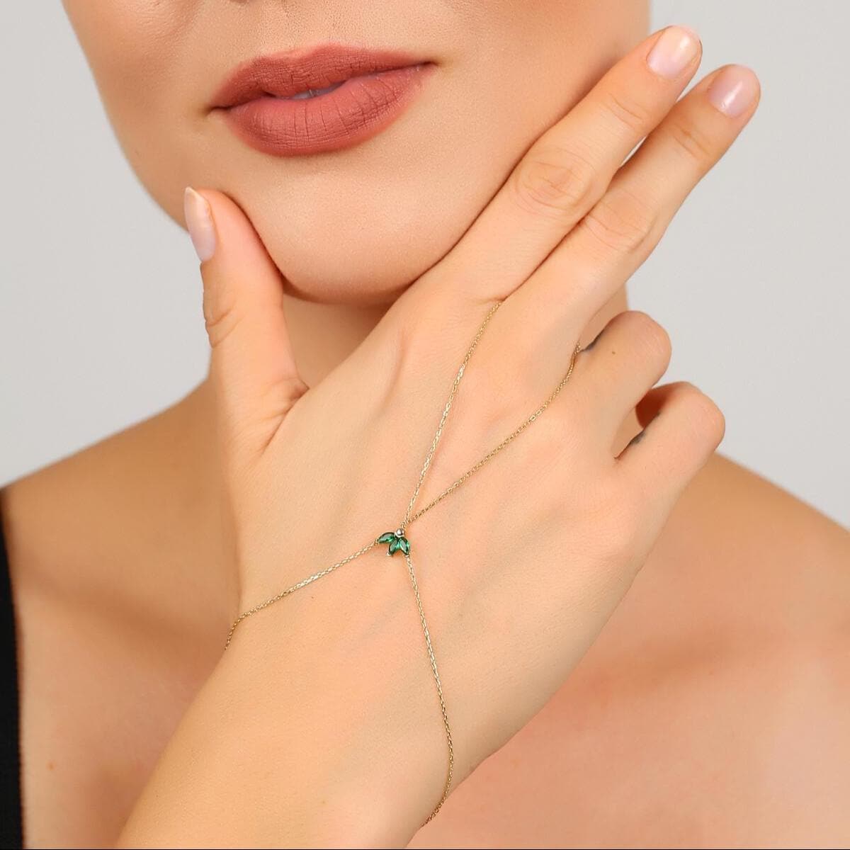 Add a touch of elegance and sparkle to your look with our 14K Gold 4-Stone Bezel Set Hand Chain Bracelet. This stunning piece is perfect for those who appreciate minimalist and sophisticated jewelry, ideal for both daily wear and special occasions.
