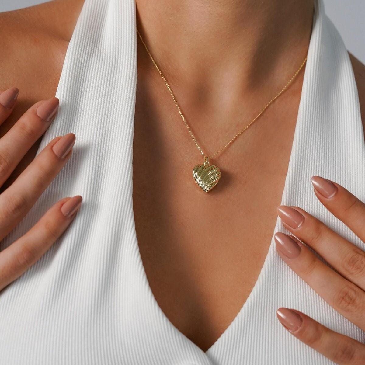 This 14K Gold Textured Heart Pendant Necklace is a timeless and elegant piece designed to add a touch of sophistication to any outfit. The beautifully crafted ribbed heart pendant hangs from a delicate 14K gold chain, creating a dainty and feminine look perfect for everyday wear.