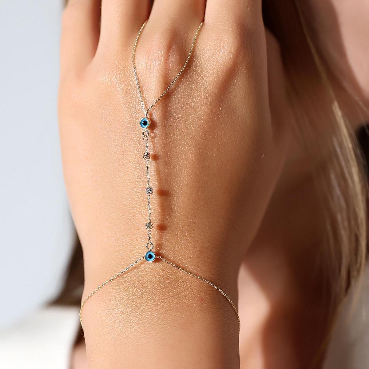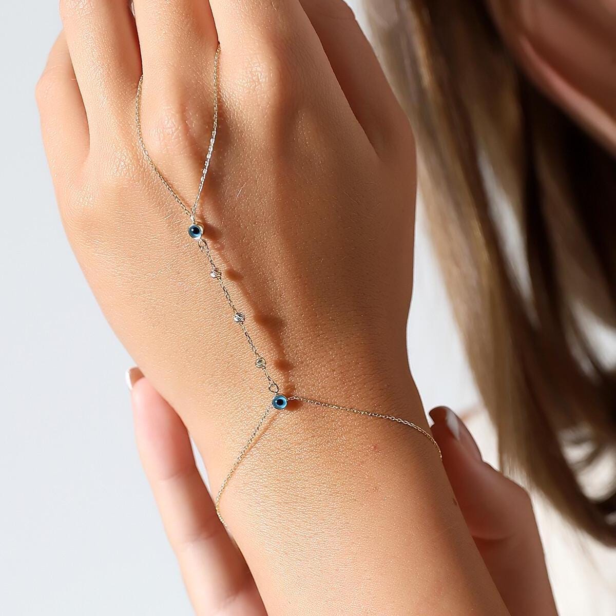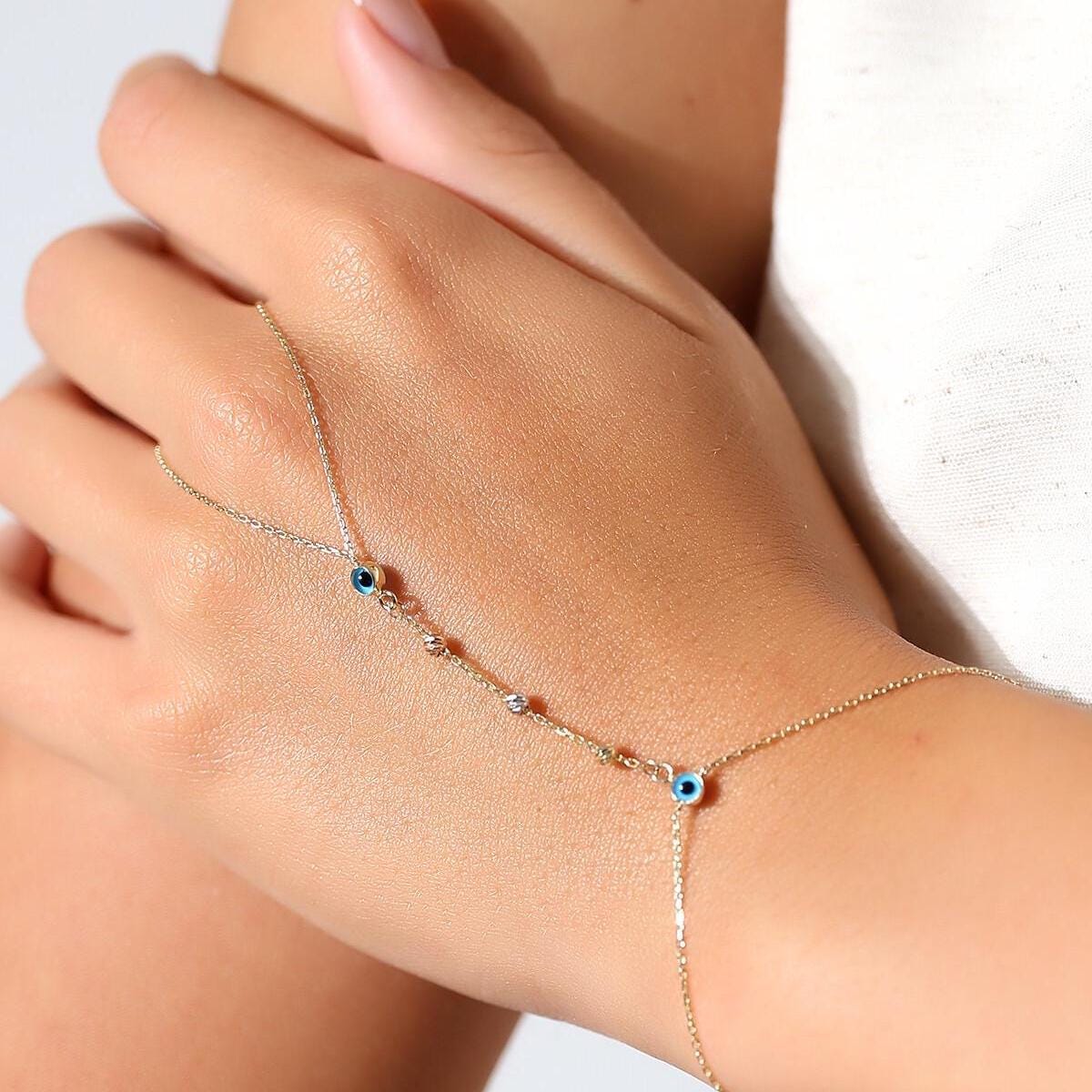 Protect yourself in style with this elegant 14K gold Evil Eye hand bracelet. Featuring a delicate finger link chain and beaded accents, this boho-inspired bracelet is perfect for everyday wear or special occasions. The Evil Eye charm symbolizes protection, making it a thoughtful gift for loved ones.