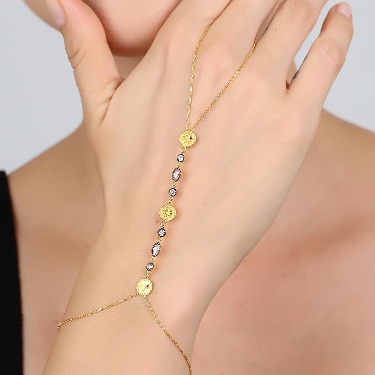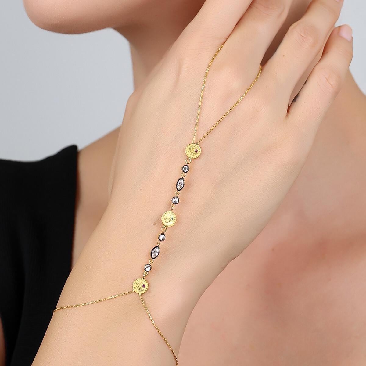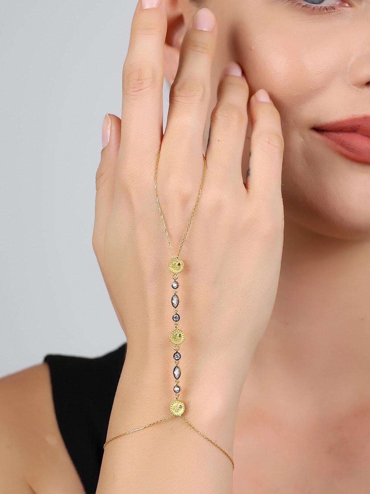 Add a touch of heritage and elegance to your look with this 14K Gold Ottoman Tughra Hand Chain Bracelet. Designed with a delicate finger link chain, sparkling CZ gemstones, and intricate Tughra-inspired motifs, this piece beautifully blends tradition with modern minimalism. Perfect for everyday wear or special occasions.